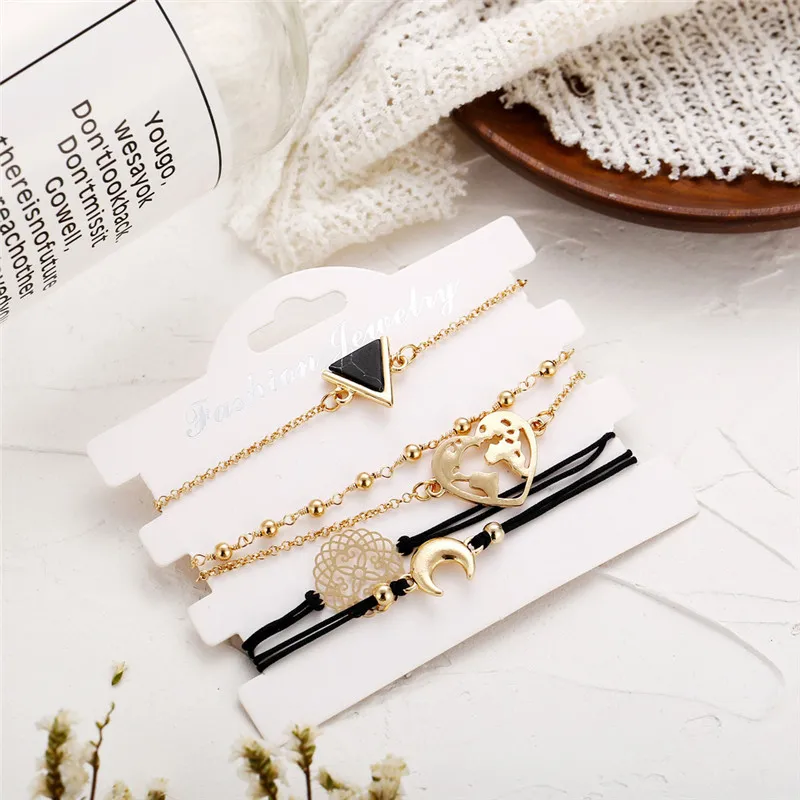 Promo BUY 5Pcs/Set Retro Bohemia Style Heart Map Moon Triangle Charm Bracelets For Women Fashion Black Ro
